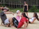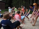 Přestože oddíl 910 již dávno odrostl věku, kdy trávil čas na pískovišti, dnešní dopoledne strávil hrátkami na beach hřišti. Většina aktivit ale spadala do kategorie "tělolezení", což je úplně jiný sport, než mlácení lopatičkou do bábovičky, nebo stavění hradů. Závody začaly píďalkami (viz foto). Po trakárcích, opičákovi, hadovi kolem pasu a celooddílovém megatrakaři (letos bohužel nedokončeném) dopoledne vrcholilo lovem želviček. Nejrychlejší turboželvou se stal Petr Kohoutek, vítězem v kategorii pískomil se však stal celý oddíl.